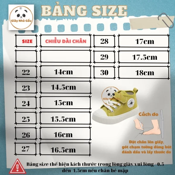 CHÚ Ý: vui lòng đo chân con từ gót đến ngón dài nhất cộng thêm 0.5-1cm rồi đối chiếu với bảng size ở mô tả sản phẩm.